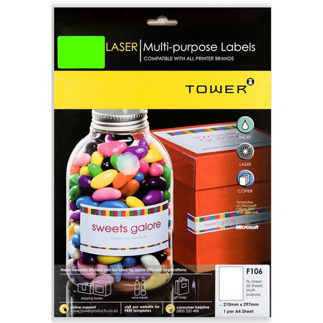 Tower F106 Multi Purpose Inkjet-Laser Labels - Fluorescent Green - Pack of 25 Sheets