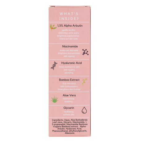 Ingredients: Aqua, Aloe Barbadensis Leaf Juice, Glycerin, Niacinamide, 1, 3-propanediol, Niacinamide, Bambusa Vulgaris (Bamboo) extract, Alpha-Arbutin, Hyaluronic Acid, Phenoxyethanol, ethylhexylglycerin, Allantonin