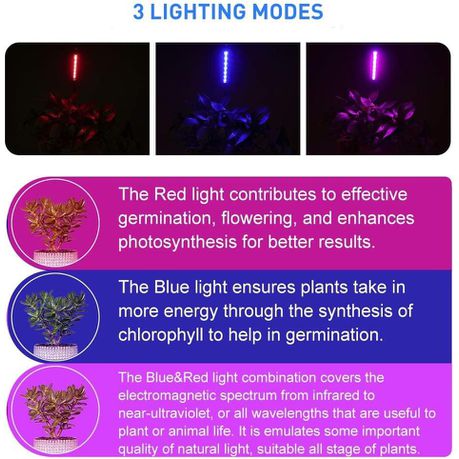 - Full Spectrum and Dimmable brightness: 3 light options (Red/Blue/Blue & Red) to meet the photosynthesis needs of a plants germination, bloom, and fruit bearing stages.