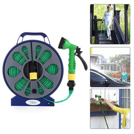 Made from tight weatherproof webbing the flat hose stores away in the reel cart with an easy wind-up feature. Along with the 7 nozzle settings are Shower, Jet, Mist, Centre, Cone, Full and Flat.