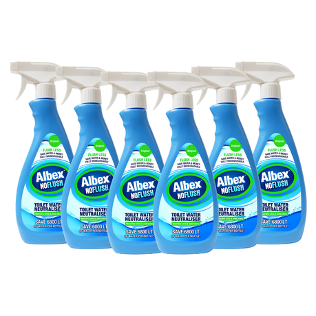 Albex Noflush is a 100% environmentally friendly and biodegradable toilet water neutraliser made from multi-stain bacillus spores, a blend of 6 specific enzymes and plant-based surfactants. Just one spray of Albex Noflush in the toilet bowl will put urine to sleep by neutralising the urine and leaving behind a fresh scent and blue colour. You can save 6800LT of clean water with every 500ml bottle of Albex Noflush. One bottle has an 860 spray capacity, giving you 860 uses before having to replace the bottle.