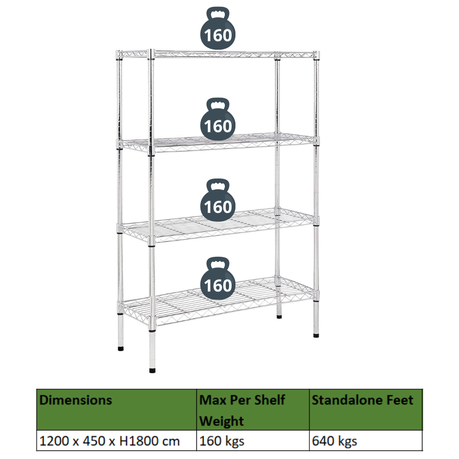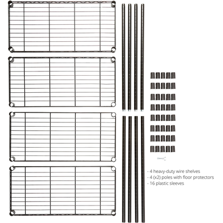 Constructed of durable steel with a black-coated chrome finish, the stylish four-shelf shelving unit offers the best of both rugged reliability and modern appeal. Even more, adjustable leveling feet allow the shelving unit to be placed on uneven ground--a simple twist is all it takes to stabilize.