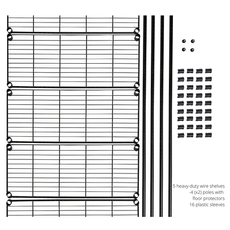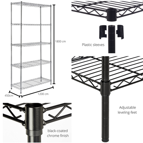 Constructed of durable steel with a black-coated chrome finish, the stylish five-shelf shelving unit offers the best of both rugged reliability and modern appeal. Even more, adjustable leveling feet allow the shelving unit to be placed on uneven ground--a simple twist is all it takes to stabilize.