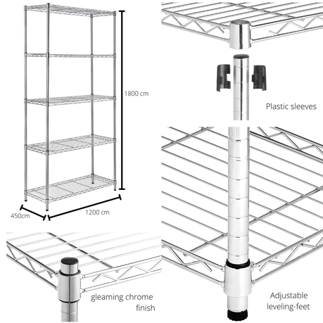 Constructed of durable steel with a gleaming chrome finish, the stylish five-shelf shelving unit offers the best of both rugged reliability and modern appeal. Even more, adjustable leveling feet allow the shelving unit to be placed on uneven ground--a simple twist is all it takes to stabilize.