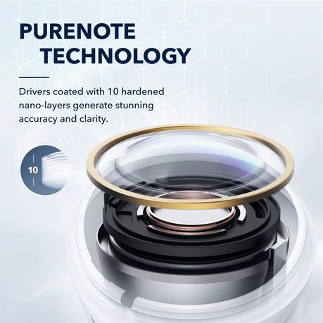 PureNote Driver Technology: Get a 45% boost to your bass, and a 30% wider frequency bandwidth than ordinary drivers. Drivers coated with 10 hardened nano-layers offer incredible stiffness to generate stunning accuracy and clarity.