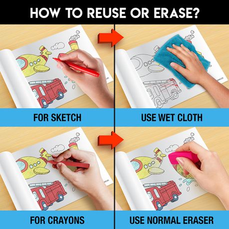 • REUSABLE: You can enjoy colouring on the rolls with any material like sketch pens, crayons, washable crayons & water colours. Erase the crayons with a regular eraser. Wipe the sketch pen or washable crayons with a wet cloth.
