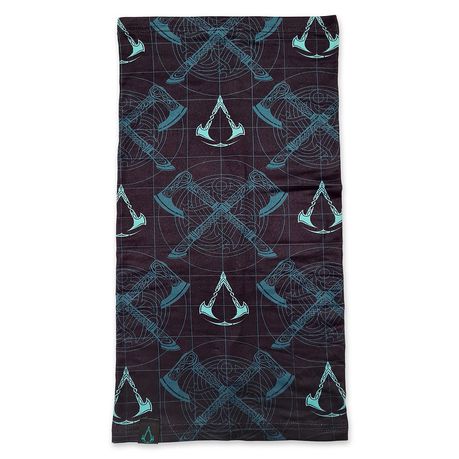 1st scarf: Black and teal featuring Assassin's Creed Valhalla logo all-over pattern