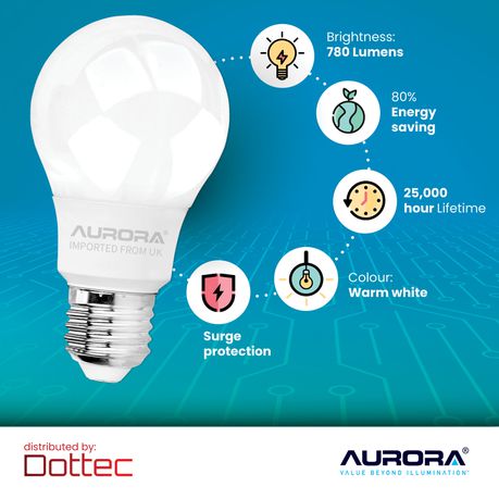 The Aurora LED is a premium quality light bulb providing a clean bright light that will last for more than 10 years. Whether for ceiling lights, table lamps or wall fittings, the range of non-dimmable GLS lamps are perfect for illuminating rooms and areas where bright and clean lighting is needed. The GLS range has proved to be exceptionally reliable delivering up to 800 lumens, allowing for direct halogen lamp replacement at a fraction of the energy consumption.
