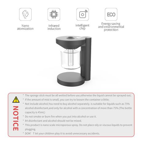 Auto Infrared Sprayer: Intelligent infrared induction, nanoscale microporous atomization. Spray out the atomized solution(such as alcohol) from sterilizer, through touchless induction (sensing distance<5.9inch), avoid cross-infection, achieve fast and convenient disinfection.