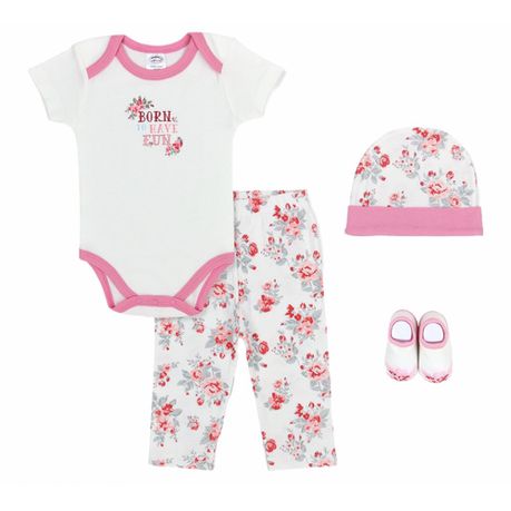 These adorable set of 4 pieces Layette consists of a bodysuit, a hat, socks and pants. The baby bodysuit included expandable envelope neckline for easy dress and snap closure buttons at the bottom for speedy diaper change. Come with a hat to keep baby warm and makes the complete ensemble