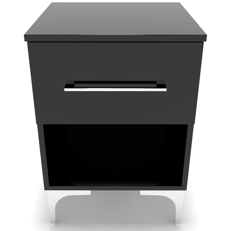 The High Gloss one drawer pedestal in black high gloss is the modernists dream. Its sleek look and chrome hardware will make it stand out in any bedroom. One roomy drawer provides plenty of space to keep your bedside space clean and clutter free; with the clever addition of a shelf to neatly stow books and magazines.