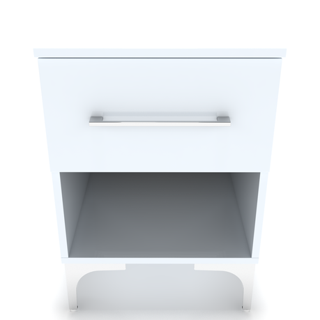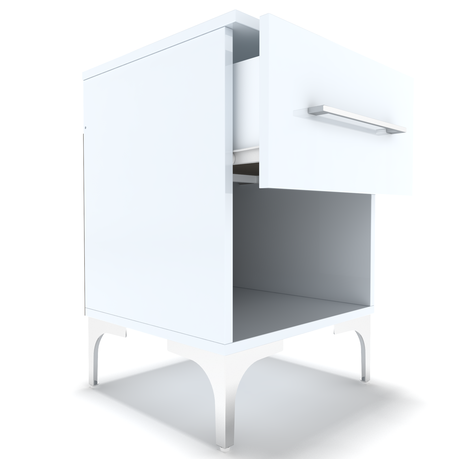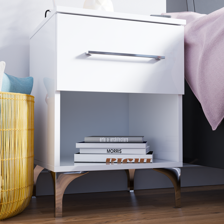 The High Gloss one drawer pedestal in white high gloss is the modernists dream. Its sleek look and chrome hardware will make it stand out in any bedroom. One roomy drawer provides plenty of space to keep your bedside space clean and clutter free; with the clever addition of a shelf to neatly stow books and magazines.