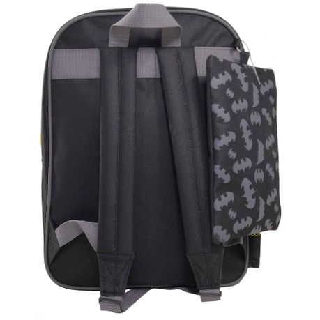 Batman brand with one main compartment, front external pocket, side mesh water bottle pocket and a pencil case.