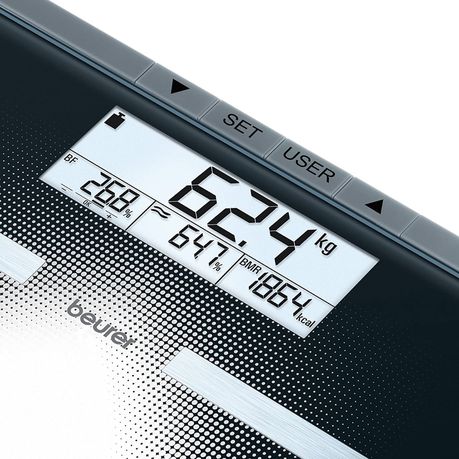 Diagnostic bathroom scale showing weight, body fat, body water, muscle ratio, bone mass, AMR/BMR calorie display. Large LCD display with 2-line multi-display shows you all your measurements at a glance.
