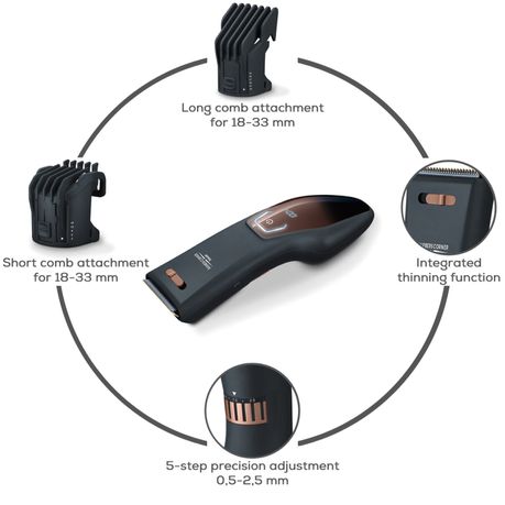 Professional haircut at home. A salon-quality haircut is even possible at home with these Beurer hair clippers. Different attachments and accessory parts allow for versatile and individual hairstyles. Thanks to the powerful battery, the hair clipper can also be used cordlessly.