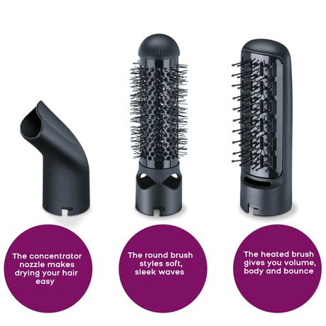The 3 interchangeable attachments have got you covered: the round brush styles soft, sleek waves, the heated brush gives you volume, body and bounce and the concentrator nozzle makes drying your hair easy.