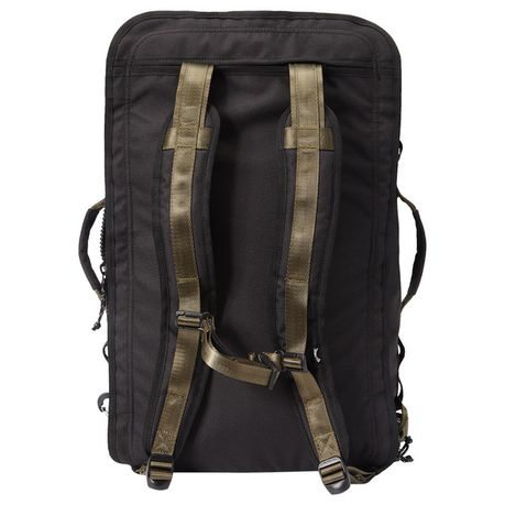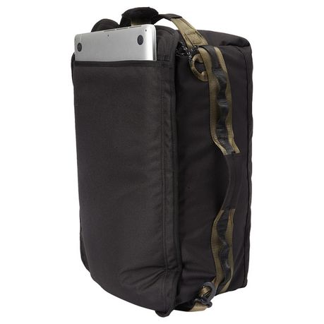- Medium-size travel duffle bag with large main compartment; removable shoulder strap; hide away padded shoulder straps; front zippered sleeve pocket; and two fixed carry handles.