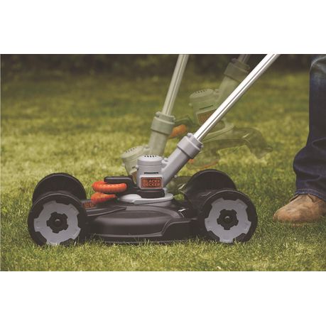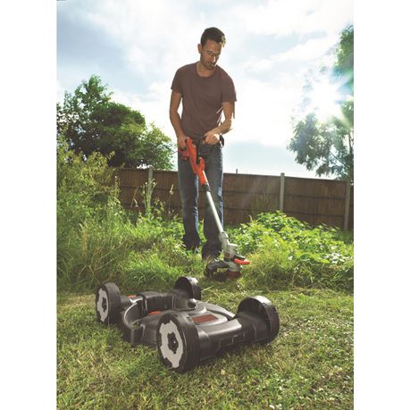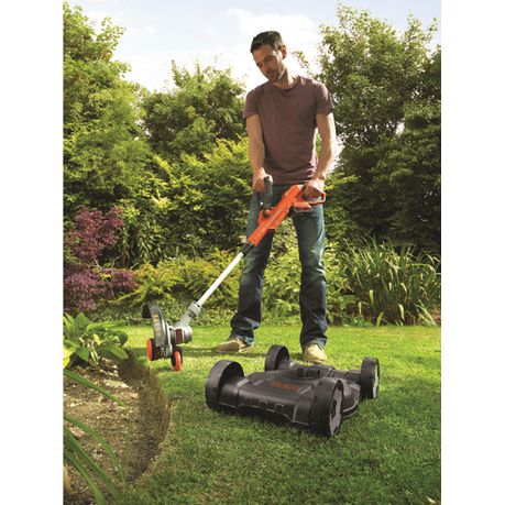 The 18V lithium-ion 3-IN-1 Strimmer takes lawn care versatility to a new level. The Strimmer has a 28cm cutting swath and high torque E-Drive gear system for easy cutting through tall grass and overgrowth. Quickly convert your Strimmer to edging mode, with the precision guide wheel helping you achieve perfect lawn and flower bed edges. Simply click the Strimmer into the lightweight wheeled base and use your Strimmer like a mower, for easier and more consistent cutting over small turfed areas. Part of the Black & Decker 18V lithium-ion system. One battery system, endless possibilities.