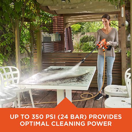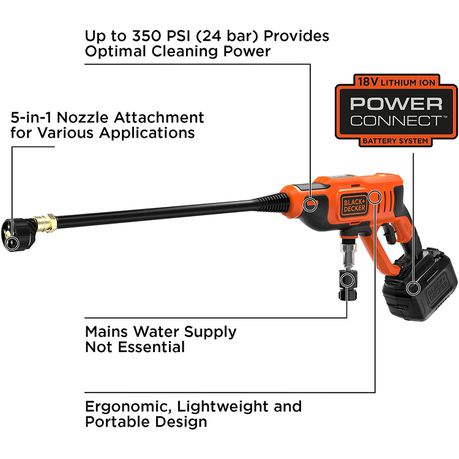 The BLACK+DECKER 18V Pressure Cleaner is perfect for a variety of applications outside the home and on the go. Its portable design draws water from various sources such as buckets, water tanks, ponds and mains supply. The 5-in-1 Nozzle attachment affords the freedom to select the right nozzle for the job and up to 350PSI cleaning power is suitable for a multitude of tasks. Part of the 18V POWERCONNECT battery system, the interchangeable cordless battery system that works with all BLACK+DECKER 18V cordless products.