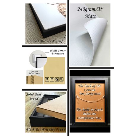 - Canvas stretched onto solid pine wood +eco-friendly PP black frame