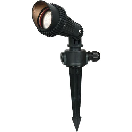 Engineer plastic with glass cover and plastic lip - swivels and tilt - plastic garden spike for ground - 1x 35 watt GU10 (not included)