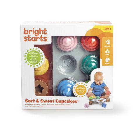 Shape sorting is a piece of cake with the Sort and Sweet Cupcakes Shape Sorter from Bright Starts! Each of the 6 easy-to-grasp cupcakes encourages the development of fine motor skills as baby discovers squares, triangles, circles and more. Easily pull apart each cupcake and match the icing topper with its chocolate cakey bottom. Each cupcake stores neatly in the shape-matching pan! Discover a sprinkle of colours and practice shapes again and again. Who wants seconds?!