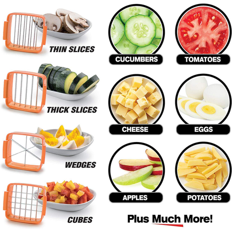 The Nicer Dicer Quick has 5 interchangeable options to chop slice or cut fruits and vegetables. It can chop into thick or thin slices and can also chop into wedges.