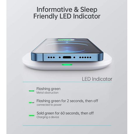 Depending on your device’s specifications, the wireless charger will automatically switch between 15W, 10W, 7.5W, 5W and 2.5W charging modes.
