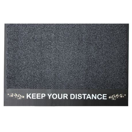 This mat indicates SOCIAL DISTANCING while also cleaning the feet, shoes and paws.