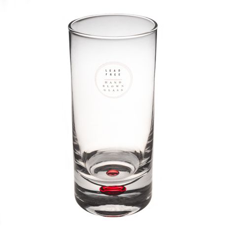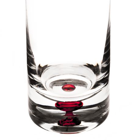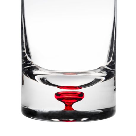 Made of perfectly rounded, thick, transparent glass poised on a base that is injected with a brilliant, vivid blob of coloured pigment, giving the drinking glasses their unique characteristic.