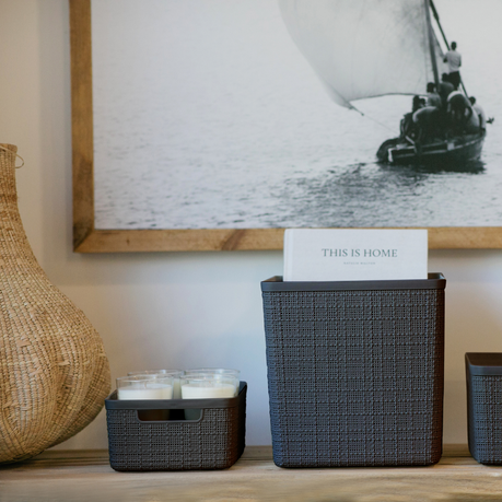 Ideal for storage and organisation around the home in a number of rooms, the Jute Basket is crafted from 100% recycled plastic; with ergonomic handles for easy carrying and is inspired by the aesthetic of handcrafted textiles