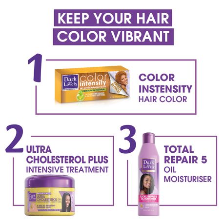 Trust Dark and Lovely Color Intensity collection specially designed by our African hair experts to deliver the best permanent hair colour for your hair. Dark and Lovely Colour Intensity Anti Dryness Permanent Hair Colour is expertly formulated to get intense permanent colour and grey coverage. It is infused with Olive Oil to nourish and condition hair whilst colouring it.