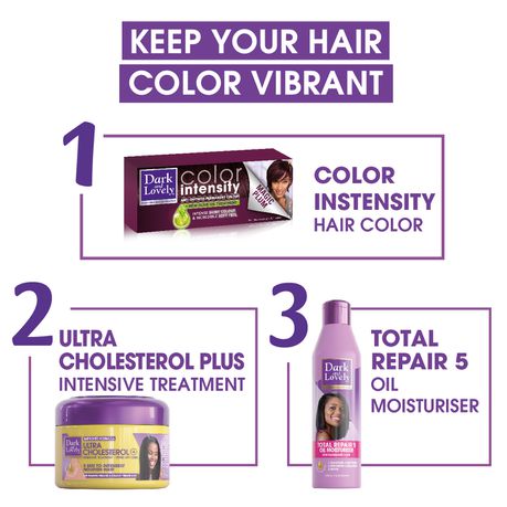 Trust Dark and Lovely Color Intensity collection specially designed by our African hair experts to deliver the best permanent hair colour for your hair. Dark and Lovely Colour Intensity Anti Dryness Permanent Hair Colour is expertly formulated to get intense permanent colour and grey coverage. It is infused with Olive Oil to nourish and condition hair whilst colouring it.