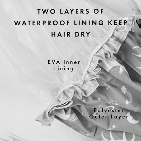 - Dual lining - The cap features two layers of waterproof lining to keep hair completely dry. The outer layer is a satin; the inner layer is an EVA polyester.