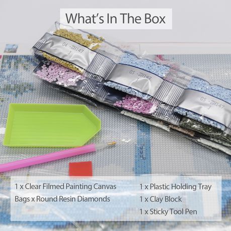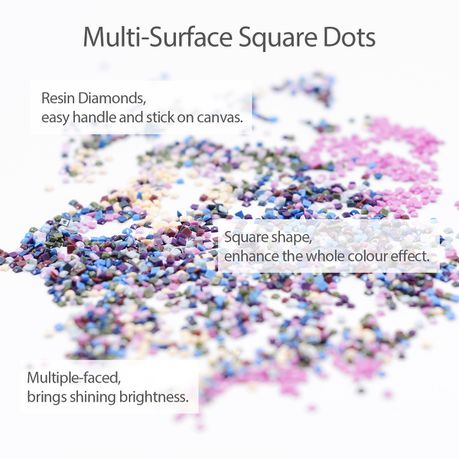 - Square resin diamonds cover the whole grid of canvas that enhance the whole colour effect of the artwork.