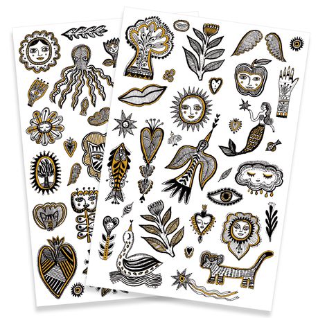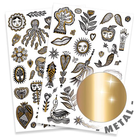 Two sheets of realistic temporary tattoos with chic, detailed and playful designs. Children will love these tattoos, complete with golden highlights. These temporary tattoos are pre-cut to make them easy to use and transfer using a little water. Dermatologically tested.