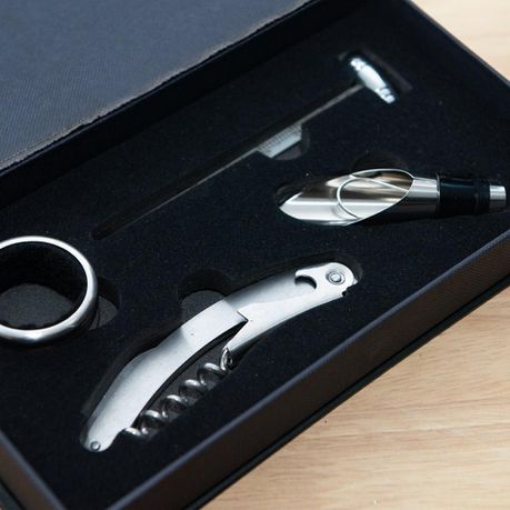 Wine Set Stainless Steel - 4-piece This set comes in a beautiful storage box and contains a corkscrew with which you can open the wine bottle professionally and easily. The wine thermometer that is included allows you to serve the wine at the right temperature. If you want to pour the wine in style, you can use the pouring cap. Spilling wine is no longer possible due to the bottle ring. With this set you are completely ready to serve the perfect wines.