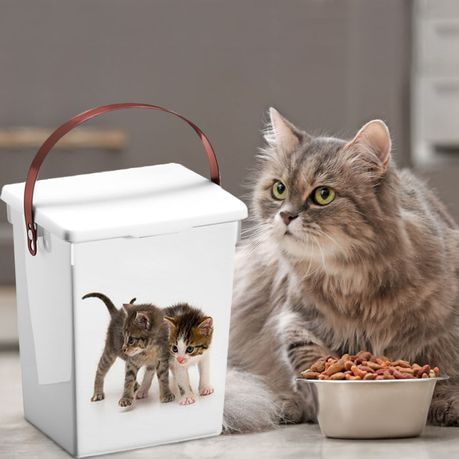 Great for pet food; easy to clean and scoop food from, and tight lids keep out moisture and humidity. Lid snap tight to help keep pet food fresh. Eco Pet Storage Container 5 litre with carry hand and lid. Pet Print Dog or Cat on side of container.