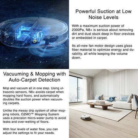 Allows DEEBOT N8 to automatically increase suction power on carpets when vacuuming and automatically avoid carpets when mopping, keeping the cleaning experience completely automated.