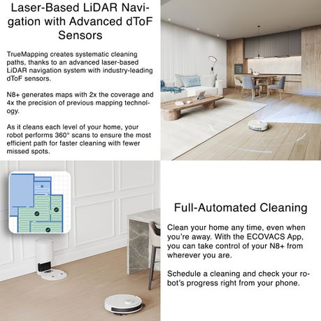 DEEBOT N8 is equipped with brand new TrueMapping dToF LiDAR laser mapping technology which can map your home with 4X the accuracy, 2X the distance.
