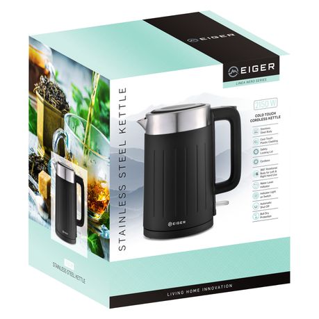 The Eiger Linea Nero Series cool-touch stainless steel kettle's striking textured design is sure to be the centre point of your kitchen countertop. The matte-black finish with brushed stainless steel accent will lend a stylish contemporary look to your kitchen, while the high-quality features ensure that the product performs to the highest international standards.