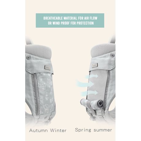This product comes with a removable sunhat (front cover) for protection from the elements when you are walking with your baby outside, like wind and sun. The front part of the carrier has a zip so that it can be rolled up to make your baby more comfortable in summer with a mesh breathable fabric.