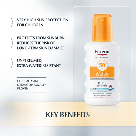 Eucerin Kids Sun Spray Sensitive Protect SPF 50+ is clinically and dermatologically proven to be suitable for children’s sensitive skin including skin with Atopic Dermatitis. It can be used on children of three years and older.