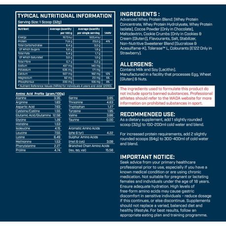 Manufactured in a facility that processes, Egg, Wheat (Gluten) & Nuts. Advanced Whey Protein Blend: (Whey Protein Concentrate, Whey Protein Hydrolysate, Whey Protein Isolate), Cocoa Powder (Only in Chocolate), Maltodextrin, Cookie Crumbs (Only in Cookies & Cream (Contains Gluten)), Flavourants, Salt, Stabilizer, Sucralose and Acesulfame-K Blend, Tolerase L, Colourants (E122 Only in Strawberry). Allergens: Contains Milk and Soy (Lecithin).