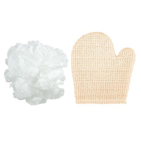The mitt features a natural ramie covering that maximises lather while massaging away impurities. Also in the bundle is a White Bath Ruffle with a diameter of 15cm which is also ideal for body cleansing in either bath or shower.