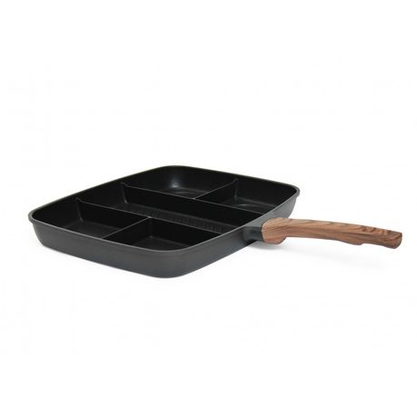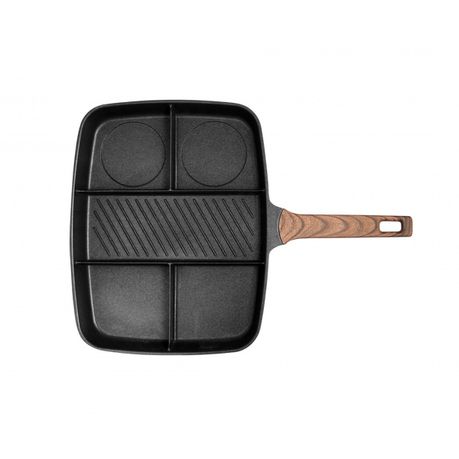 This magic pan will speed up your cooking process with the versatile 5 in 1 grilling function. The pan is divided into 5 separate sections, allowing you to cook various foods at the same time. Featuring one large area and 4 smaller sections, this works on all stovetops with heat induction. It is ergonomically designed for easier handling with the elongated soft handle and a small handle on the opposite side. The aluminium material provides durable quality for the pan to stick around for many years. Cook up some magic in your kitchen!