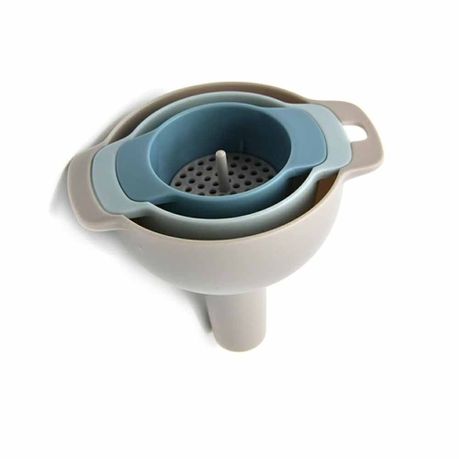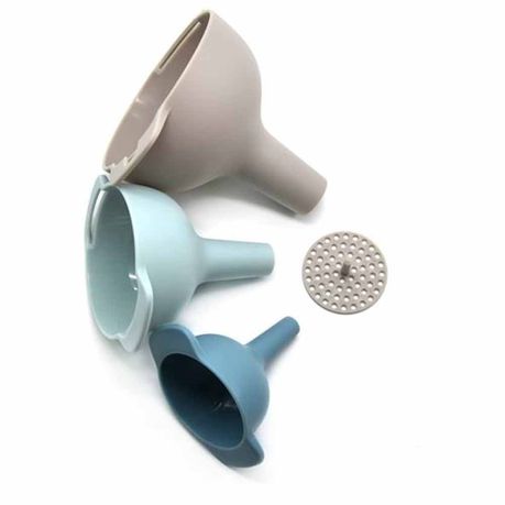 Funnels fit inside each other for easy storage. Liquid and dry use. Easy grip handles. Sizes 6cm, 8cm & 10cm in diameter. Plus strainer.