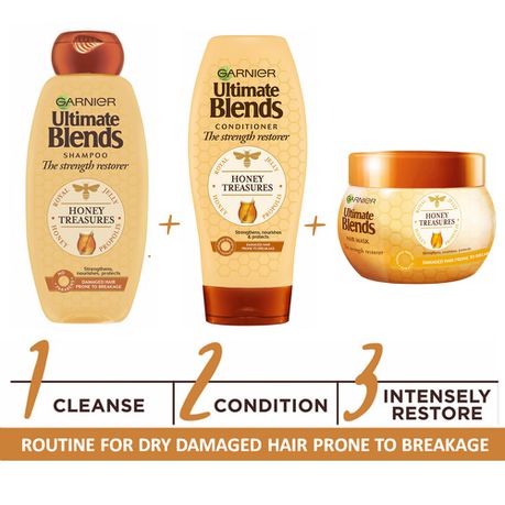How to Apply the Garnier Ultimate Blends Honey Strengthening haircare range: Massage our Honey Strengthening Shampoo into wet hair. Lather, rinse, and follow with our Conditioner for Damaged Hair. For intense care, indulge in our Honey Hair Mask or nourishing Leave In Cream.