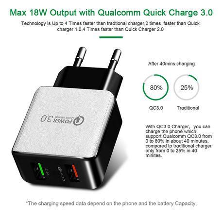 Rapidly charge your mobile phone, tablet, power banks, or even e-cigarettes with this stylish and convenient adapter. Compatible with Samsung, Apple, Xiaomi, Huawei, and any other device that requires a USB adapter. QC 3.0 compatible devices charge from 0% to 80% in 35 minutes, 50% faster than traditional chargers. Backward compatible with the older versions of Quick Charge 2.0, and conventional charging.