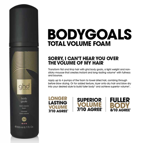 Unlock professional level volume with ghd body goals - total volume foam, a lightweight mousse designed to maximise the results of heat styling tools.